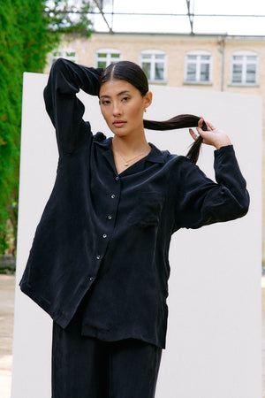Die Woven Cupro Blouse von MOYA KALA vereint minimalistisches Design mit luxuriösem Tragekomfort. Gefertigt aus nachhaltigem, 100 % gewebtem Cupro überzeugt die oversized Bluse durch ihren fließenden Fall, eine elegante Silhouette und ein samtig weiches Hautgefühl.